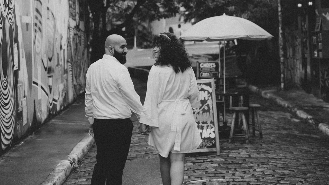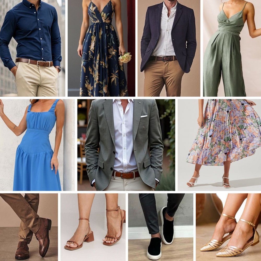 Vestido midi ou longo, macacão, calça social ou camisa. Evite saltos finos ou instáveis, pois o espaço onde a festa acontecerá tem paralelepípedo.